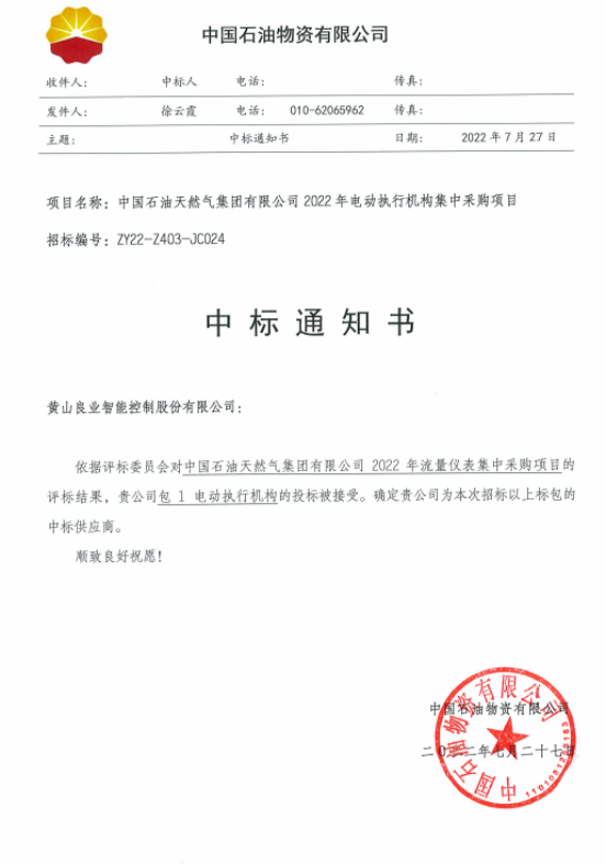 2022年7月27日,我公司收到中國石油物資有限公司的《中標通知書》,成功中標中國石油天然氣集團有限公司2022年電動執行機構集中采購項目包1:電動執行機構,中標金額480.9萬元,執行周期自采購結果公告之日起至 2023 年9 月30 日。