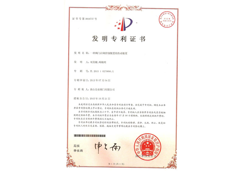 一種閥門啟閉控制裝置的傳動裝置專利證書